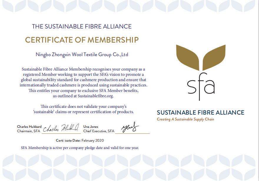 為推進(jìn)羊絨產(chǎn)業(yè)綠色可持續(xù)發(fā)展,寧波中鑫經(jīng)過前期準(zhǔn)備、申請(qǐng)和認(rèn)證,于2020年2月20日正式加入了SFA(Sustainbale Fibre Alliance)組織。