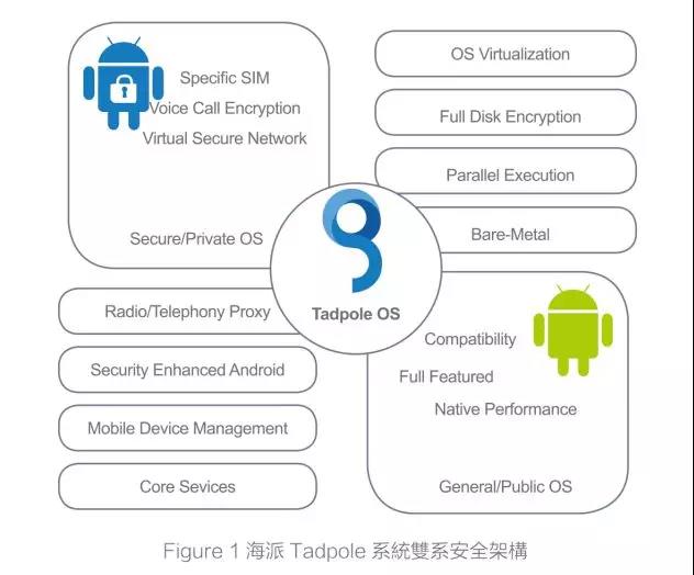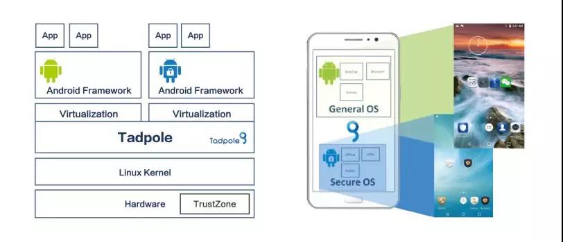 基于系統(tǒng)虛擬化技術(shù),在單一核心下執(zhí)行兩個(gè)完整的Android系統(tǒng)。每一個(gè)Android系統(tǒng)皆具備完整的執(zhí)行功能并且兼容于第三方軟件。兩個(gè)Android系統(tǒng)互不依賴,完全獨(dú)立。當(dāng)Tadpole系統(tǒng)啟動(dòng)后,可視需求或環(huán)境狀況只啟動(dòng)任一系統(tǒng),也可以據(jù)實(shí)際狀況完全關(guān)閉任一系統(tǒng)。例如在極機(jī)密環(huán)境中,公開(kāi)日常系統(tǒng) (Public/General OS) 就完全關(guān)閉,而不僅是隱藏在背景執(zhí)行。